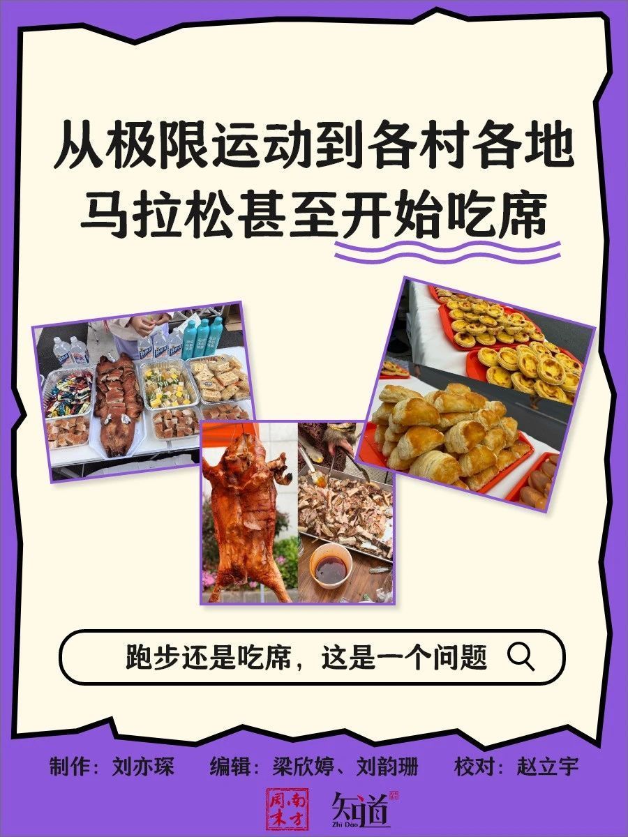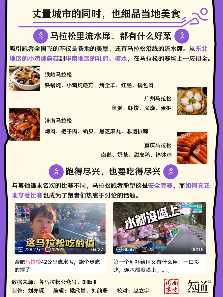 与其他追求名次的比赛不同,马拉松跑者更盼望的是安全完赛和自我超越,而如何真正地享受比赛也成为了他们热衷讨论的话题。一条名为“合肥马拉松42公里流水席,跑个步吃的(得)撑了”的视频获得了两百多万的播放量,马拉松吃席指南成为了新的流量密码。